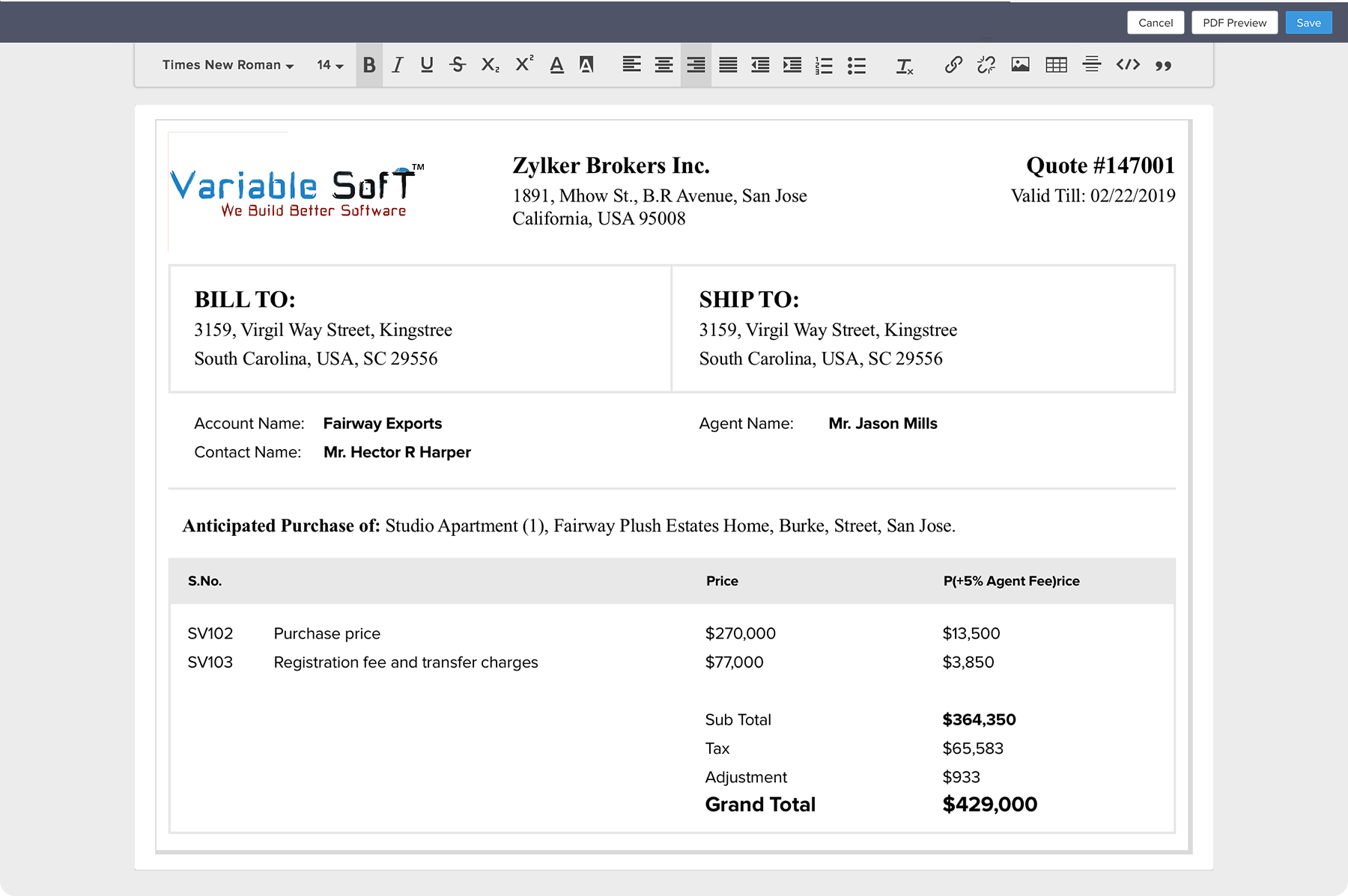 Variable soft Real estate Lead Management system helps you complete your sales team by getting your group to create save and edit invoices, quotation, pricing, and accounts bills. Deal with all your post-deals procedures utilizing inventory management features, and offer your quotation and invoice to prospects through custom email and receipt formats.